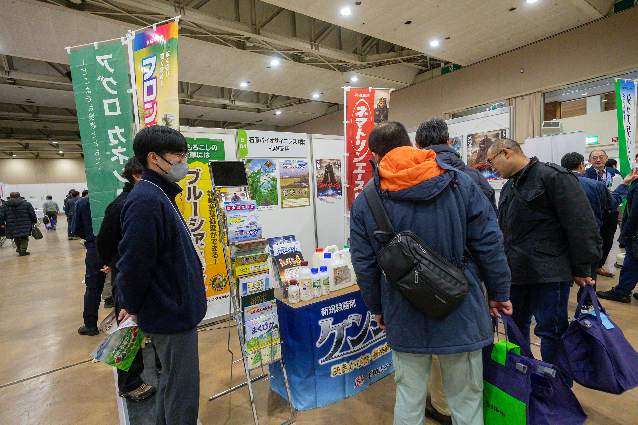 無人航空機で散布できる殺菌剤など、同社取り扱いの農薬を多数展示しました。