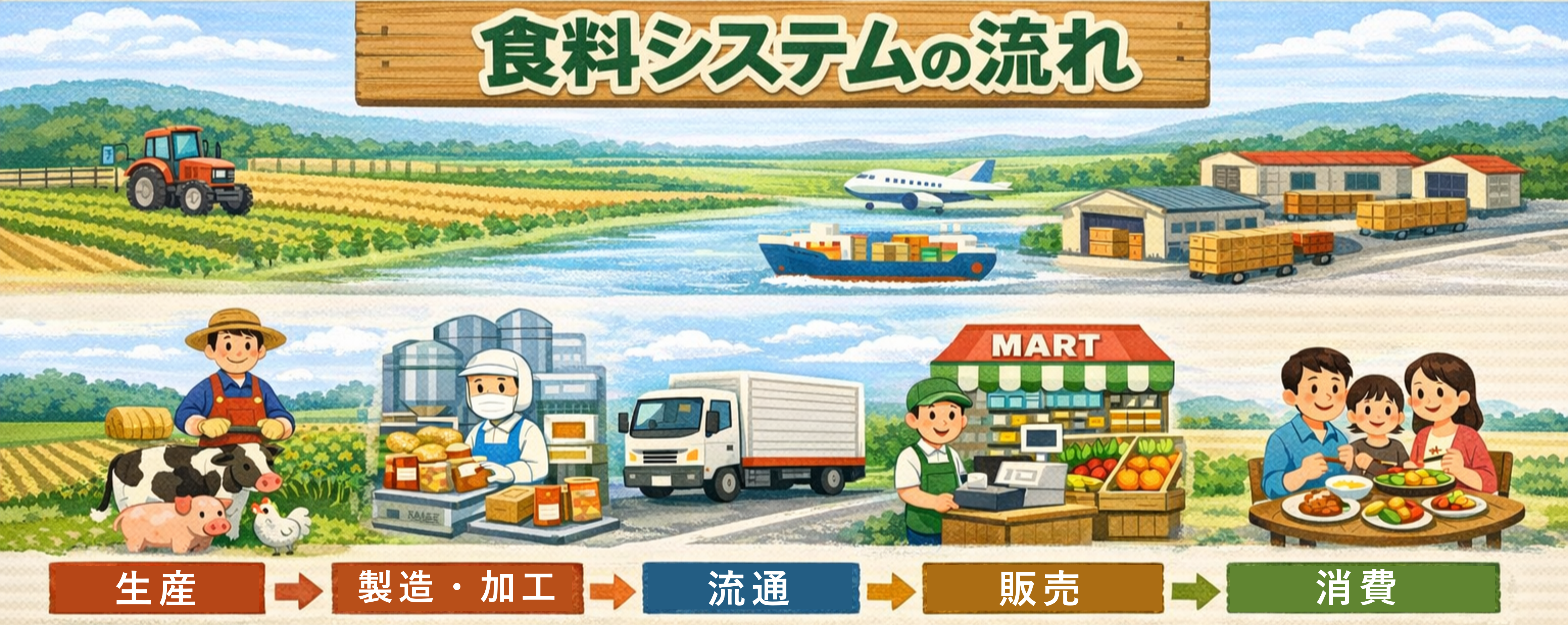 食料システムとは、食品の生産から製造、加工、流通、販売、消費に至るまで、さまざまな関係者のつながりによって成り立つ仕組みのことを指します。食料システム法は、この食料システムの関係者の連携を促すことで、食料が将来にわたって安定的に供給されることを目的としています。
